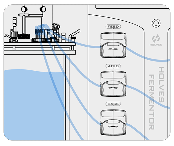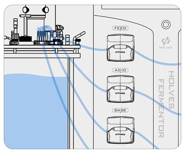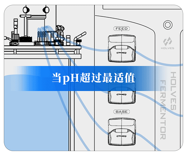 以霍爾斯(HOLVES)實驗室發(fā)酵罐為例,pH電極測定完數值后,結果會直接反饋給HF-Control V2.2控制系統(tǒng),系統(tǒng)則會根據原先設定數值進行調節(jié)補料等操作,將罐內pH值控制在最佳范圍內。