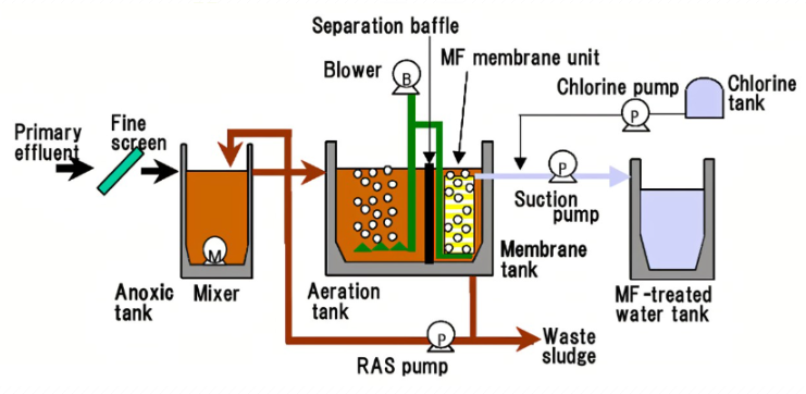 膜生物反應(yīng)器是一種新型的廢水處理系統(tǒng),它結(jié)合了膜分離技術(shù)和生物處理技術(shù),也稱為MBR。傳統(tǒng)的生物處理技術(shù)被終端二沉池膜組件取代,可以保持生物反應(yīng)器中高活性污泥濃度,有效提高生物處理有機(jī)負(fù)荷。為了減少污水處理設(shè)施的占地面積,污泥負(fù)荷可以保持較低,從而減少剩余污泥的量。主要原理是使用膜分離設(shè)備攔截水中的活性污泥和大分子有機(jī)物。其活性淤泥濃度可達(dá)8000~10000mg/L,或更高。反應(yīng)器截留效果非常明顯,可有效保留長(zhǎng)周期微生物,實(shí)現(xiàn)污水深度凈化,增加硝化細(xì)菌增殖,除磷脫氮效果更好。