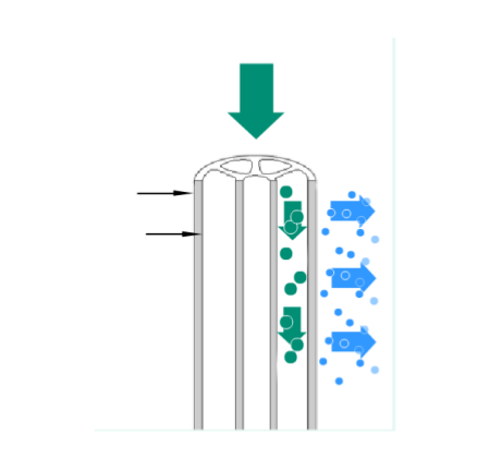 與硅藻土過(guò)濾相比,膜過(guò)濾主要是一種表面錯(cuò)流過(guò)濾。固形物被截留在膜表面或膜的孔隙中。當(dāng)產(chǎn)品以一定的流速流經(jīng)膜表面時(shí),這些固形物被沖走并保持懸浮狀態(tài),因此膜表面保持干凈、有效。運(yùn)行一定時(shí)間后膜慢慢被堵塞,這時(shí)候必須進(jìn)行化學(xué)清洗。需要過(guò)濾的產(chǎn)品流經(jīng)膜的通道:部分液體透過(guò)膜成為濾液(2),而截留液(1)繼續(xù)流動(dòng)。